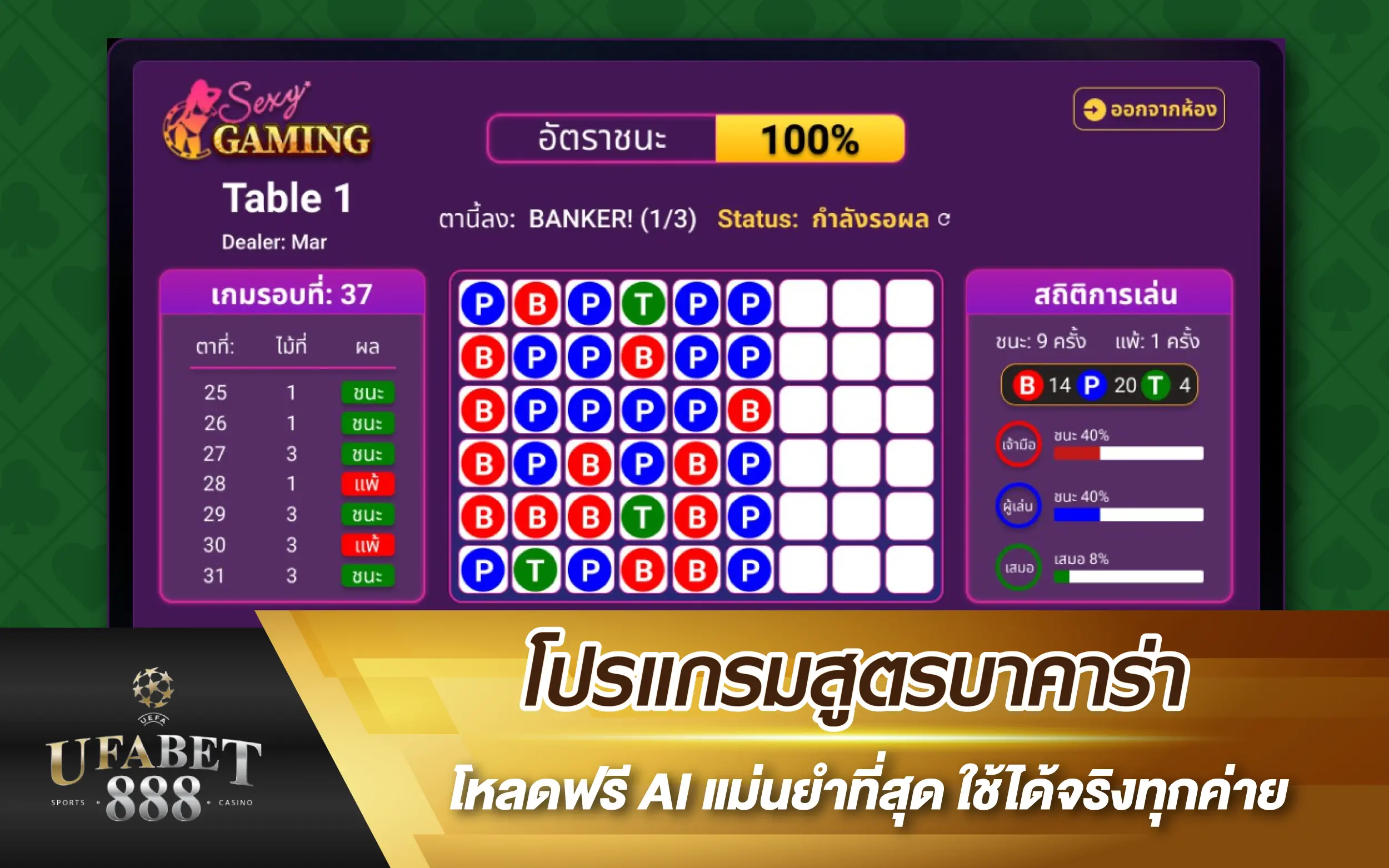 หากจะพูดถึง บาคาร่าออนไลน์ นับเป็นอีกหนึ่งเกมคาสิโนที่ครองใจผู้เล่นทั่วโลก โดยเฉพาะในประเทศไทยที่ได้รับความนิยมสูงสุด เพราะเกมเล่นง่าย มีความตื่นเต้น และปัจจุบันมีเทคโนโลยีมากมายที่ช่วยเพิ่มโอกาสในการทำกำไรที่มากขึ้นจาก โปรแกรมสูตรบาคาร่า ดาวน์โหลดฟรี ระบบอัจฉริยะจาก AI ที่ช่วยวิเคราะห์และคำนวณผลลัพธ์ให้อย่างแม่นยำ สามารถใช้ได้จริงทุกเว็บ และเหนือกว่าสูตรทั่วไปที่มักใช้เพียงสถิติพื้นฐานในการออกผลลัพธ์ต่อไม้เท่านั้น