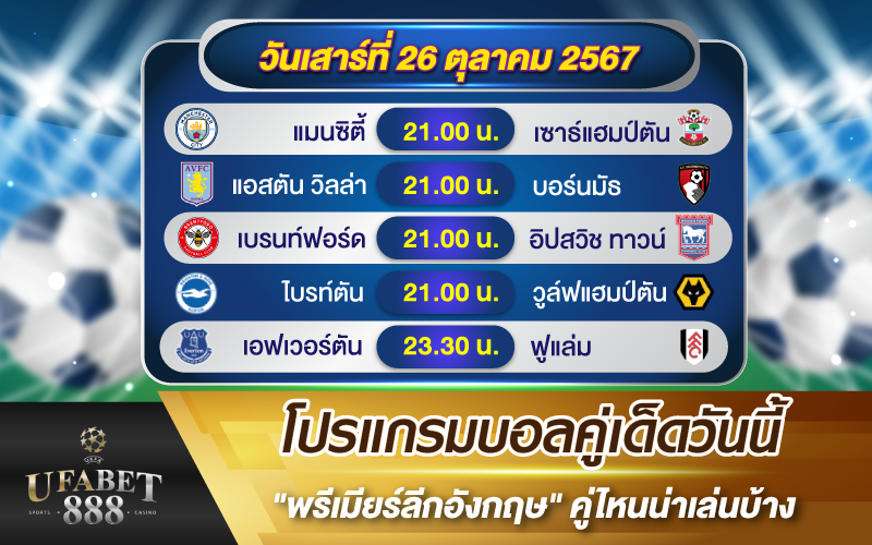 ตารางการแข่งขันฟุตบอล วันเสาร์ที่ 26 ตุลาคม 2567 คอบอลทุกท่านสามารถติดตามชมถ่ายทอดสดได้ตามวันและเวลา ดังนี้