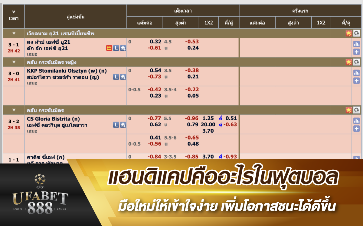 แฮนดิแคป คือ อัตราต่อรองแบบหนึ่งในการเดิมพันฟุตบอลที่เกิดขึ้นเื่อถ่วงน้ำหนักระหว่างทีมต่อและทีมรองให้ทั้งสองฝั่งมีโอกาสชนะใกล้เคียงกัน ไม่ว่าจะเป็นทีมใหญ่หรือลีกเล็กก็ตาม เมื่อเราเข้าใจถึงหลักการของบอลแฮนดิเคปดีแล้ว จะช่วยให้การเลือกฝั่งจะมีเหตุผลที่ชัดเจนมากขึ้น ไม่ใช่แค่การสุ่มเล่นเฉย ๆ และลุ้นดวงเหมือนทุกครั้ง แต่จะเป็นการวิเคราะห์ที่เพิ่มโอกาสชนะให้คุณได้ดียิ่งขึ้นนั่นเอง